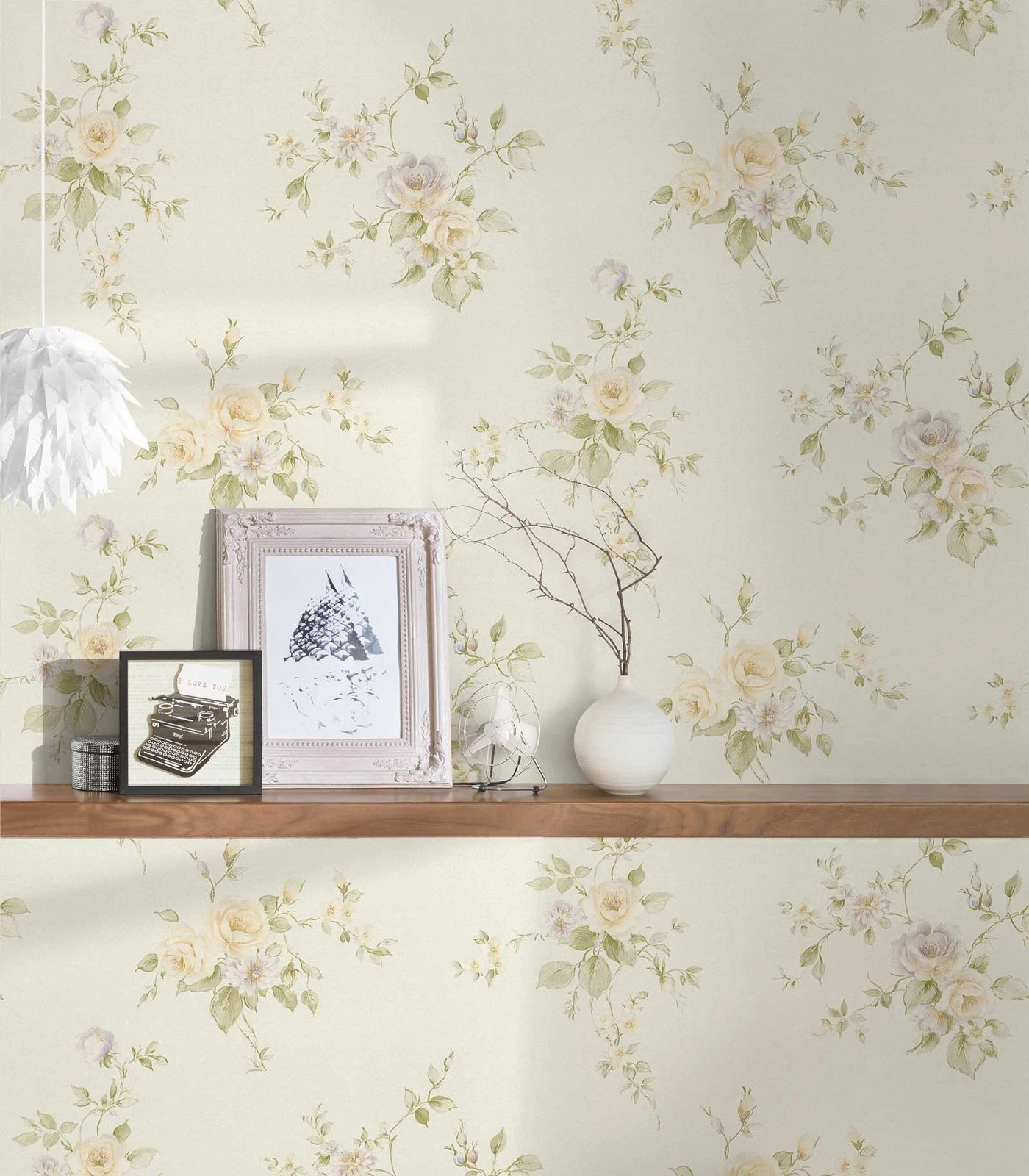 Die Vliestapeten laden zum Träumen und Verweilen ein. Die Tapete Rosenblumen in creme, grün, violett vermittelt ein natürliches und romantische Raumgefühl. Außerdem kann die Tapete mit hervorragenden Materialeigenschaften punkten.